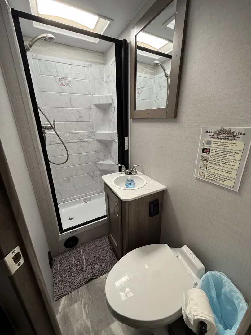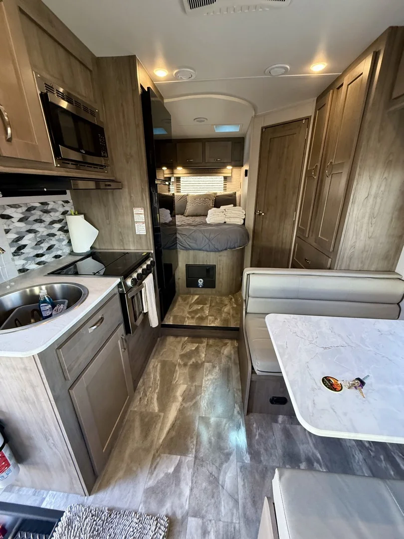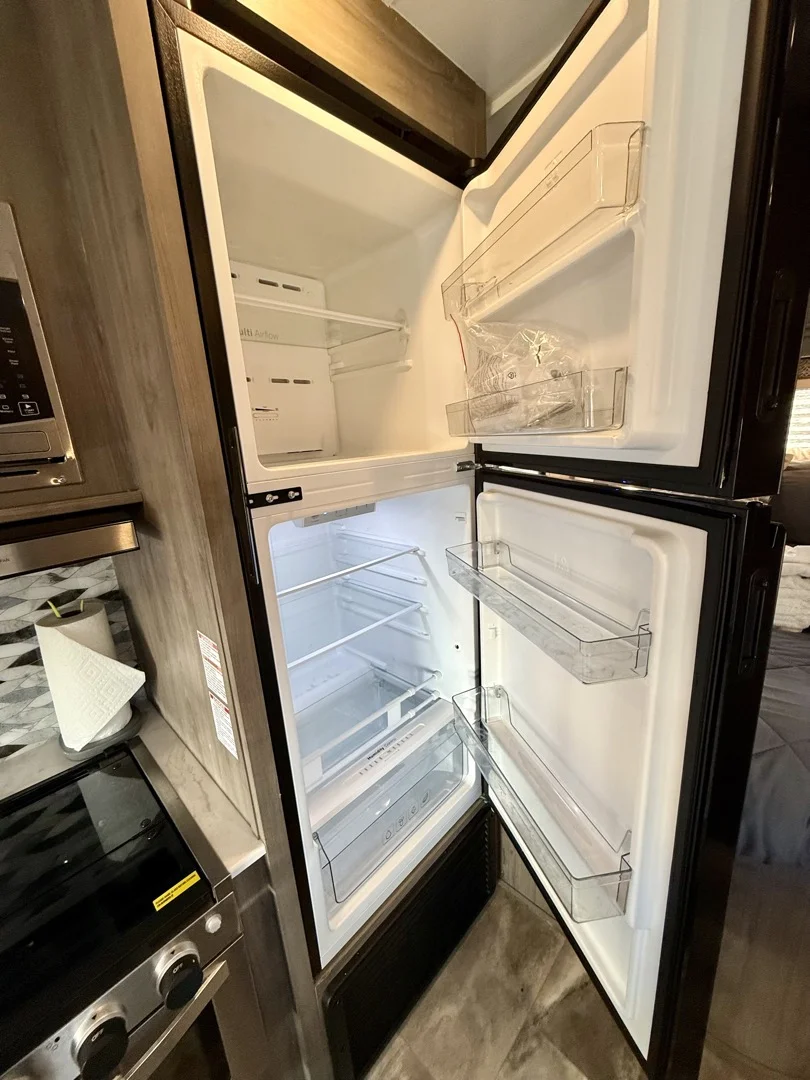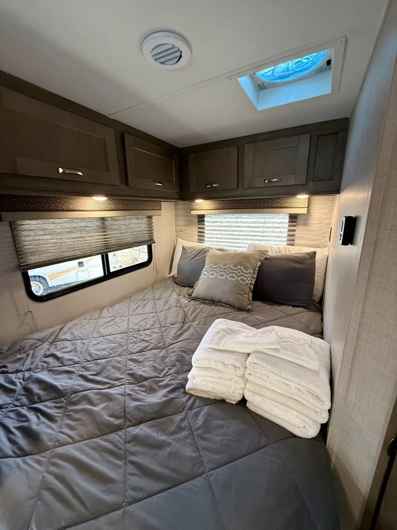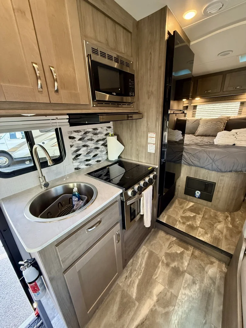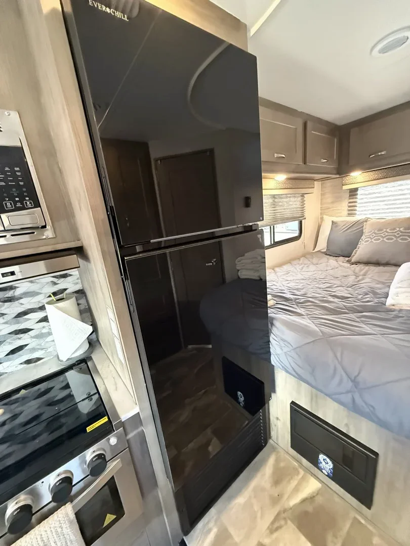 Inside, you’ll find modern finishes, a roomy queen bed, a convertible dinette, and a drop-down bunk, making it perfect for families or couples. The fully equipped kitchen includes a refrigerator, stovetop, microwave, and plenty of counter space for cooking on the go. The bathroom offers a full shower and ample storage, while the living area gives you space to relax, watch TV, or simply enjoy the journey.