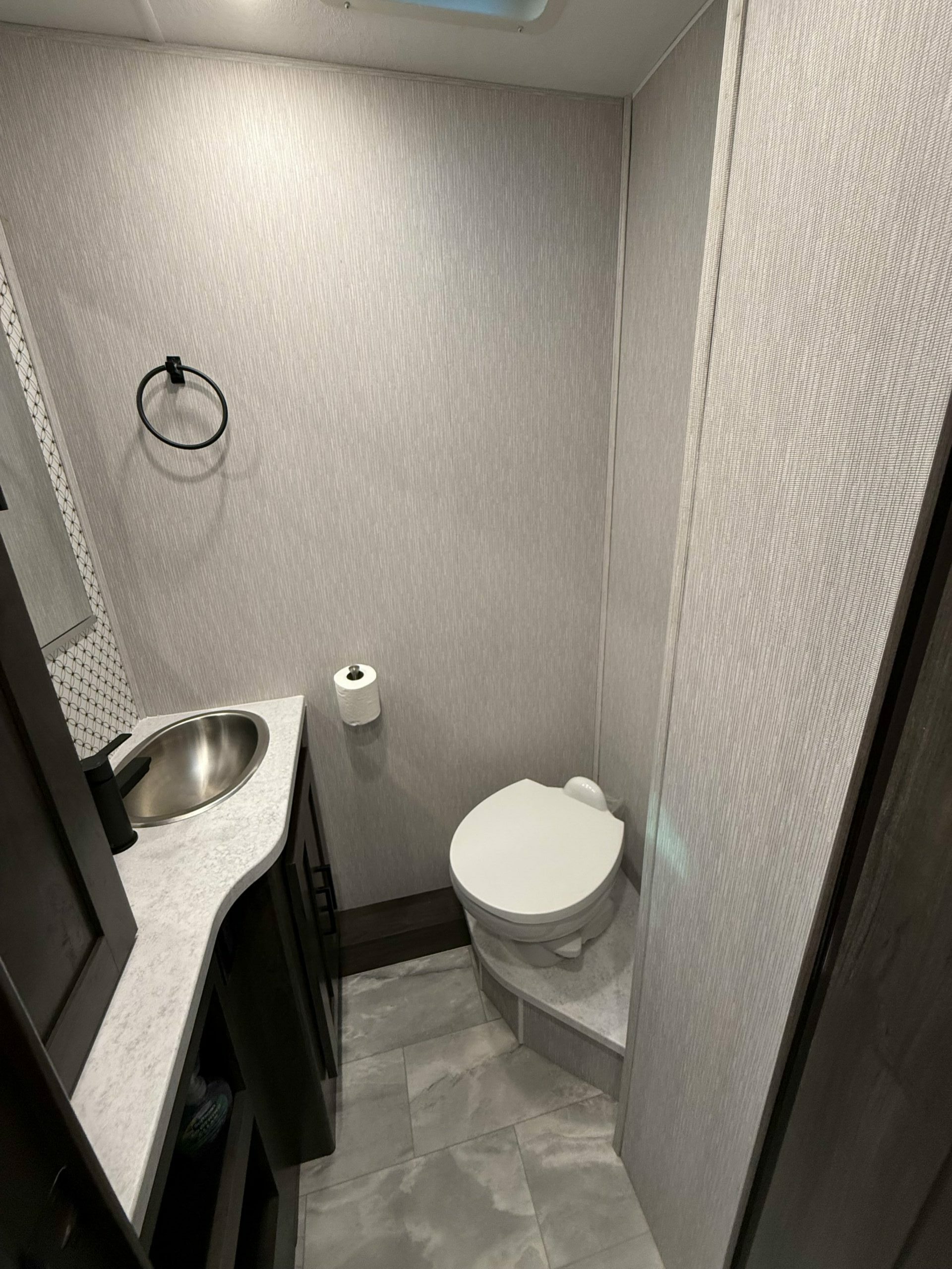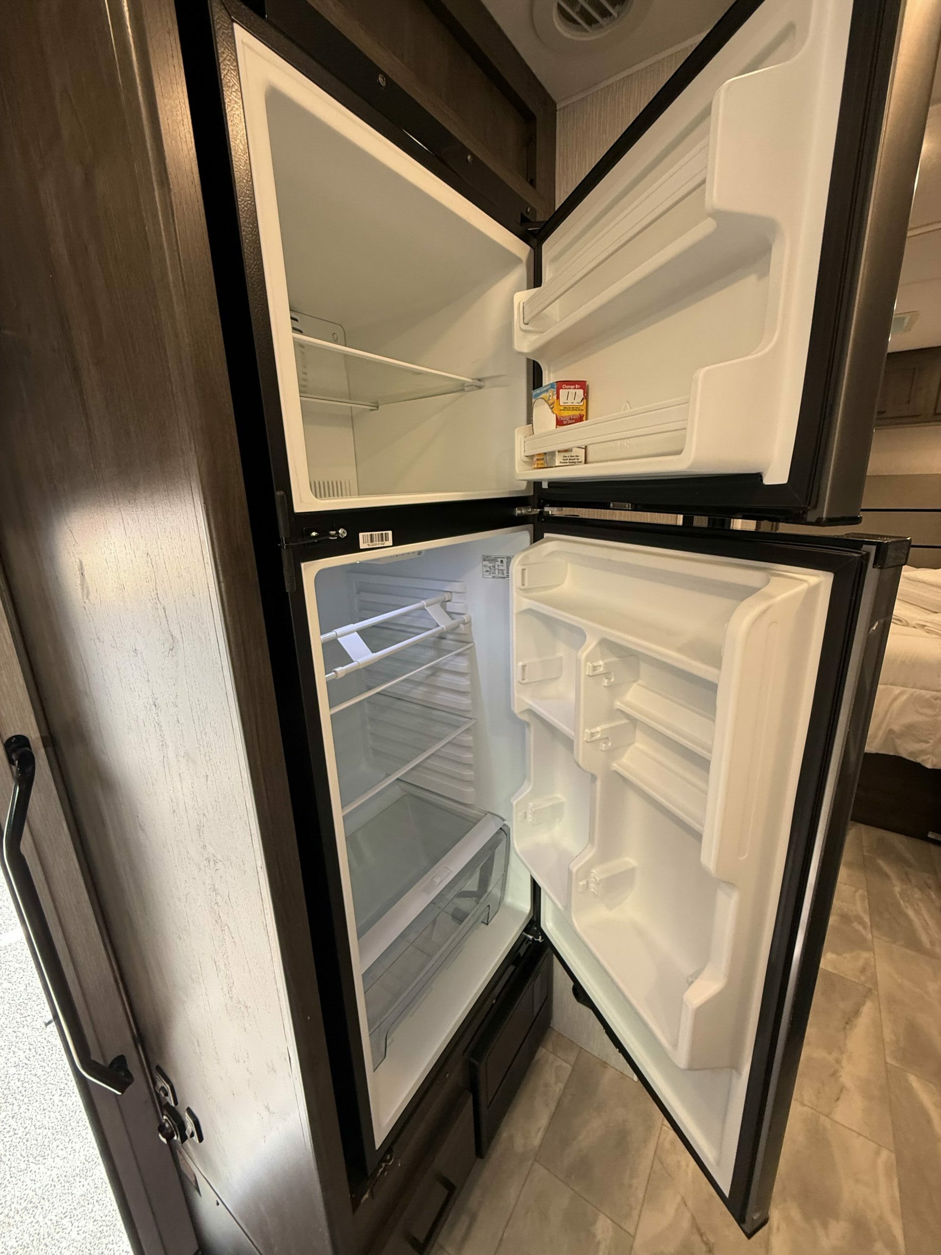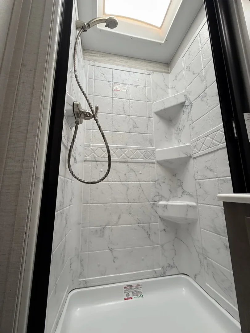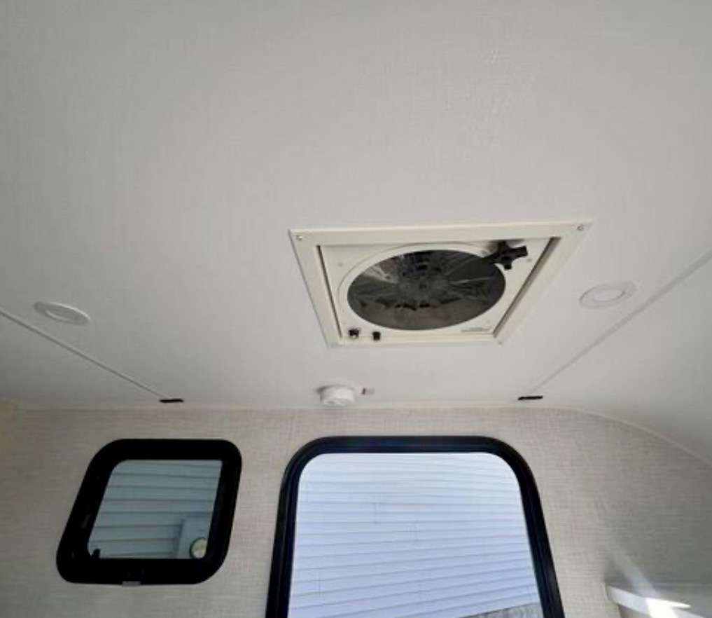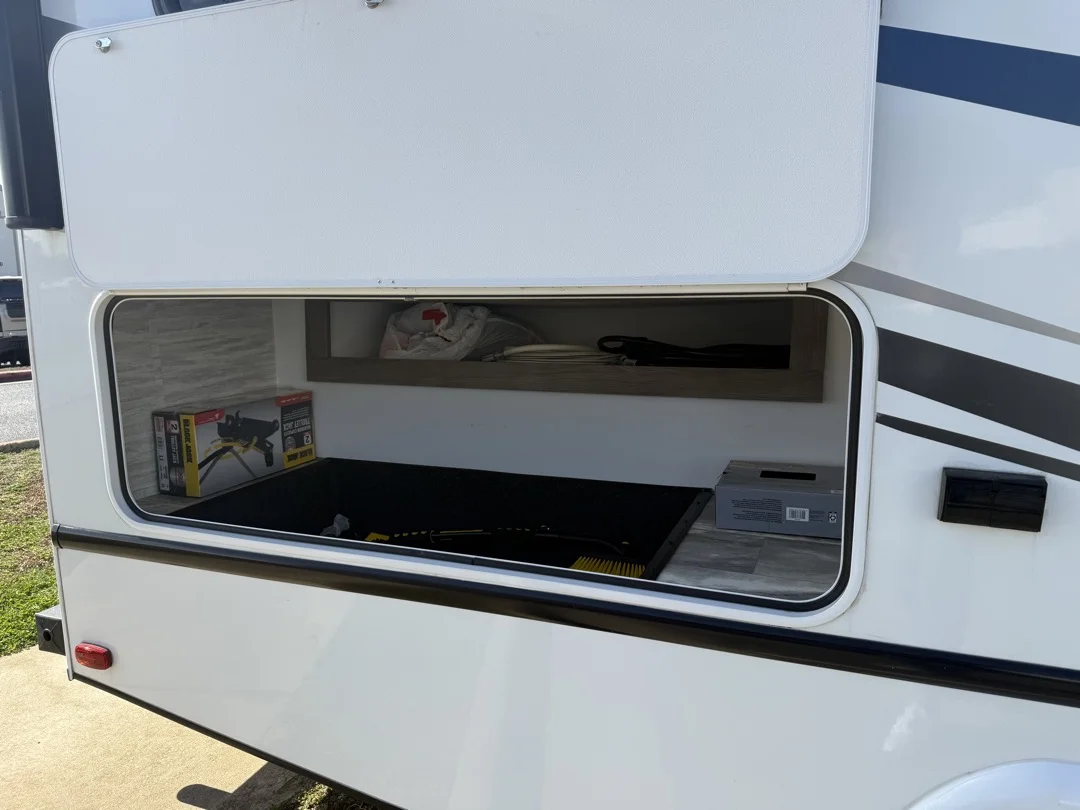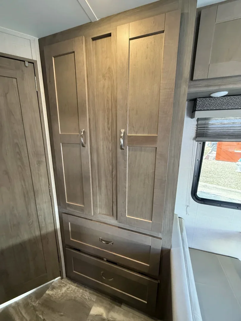 Inside, you’ll find modern finishes, a roomy queen bed, a convertible dinette, and a drop-down bunk, making it perfect for families or couples. The fully equipped kitchen includes a refrigerator, stovetop, microwave, and plenty of counter space for cooking on the go. The bathroom offers a full shower and ample storage, while the living area gives you space to relax, watch TV, or simply enjoy the journey.