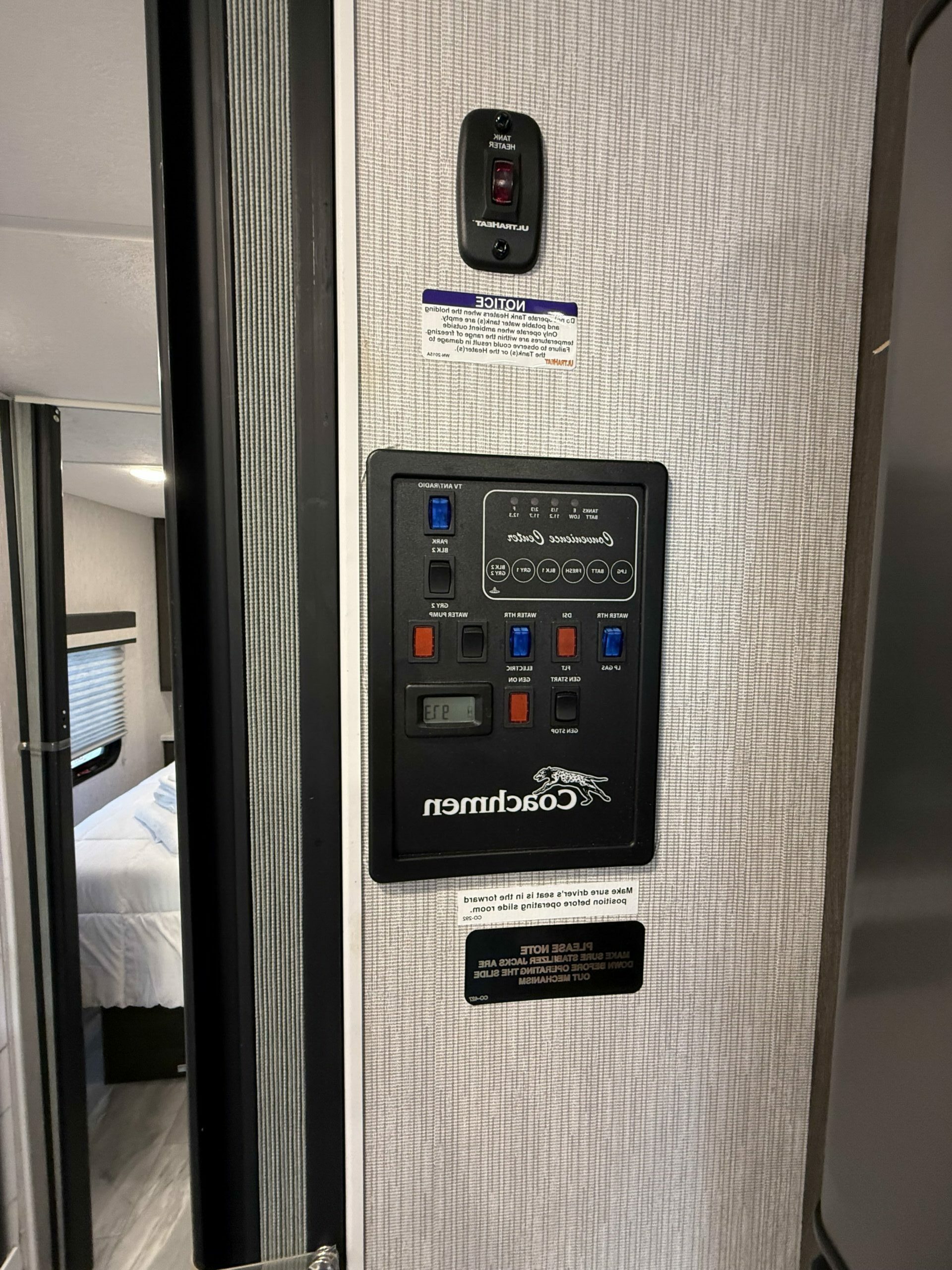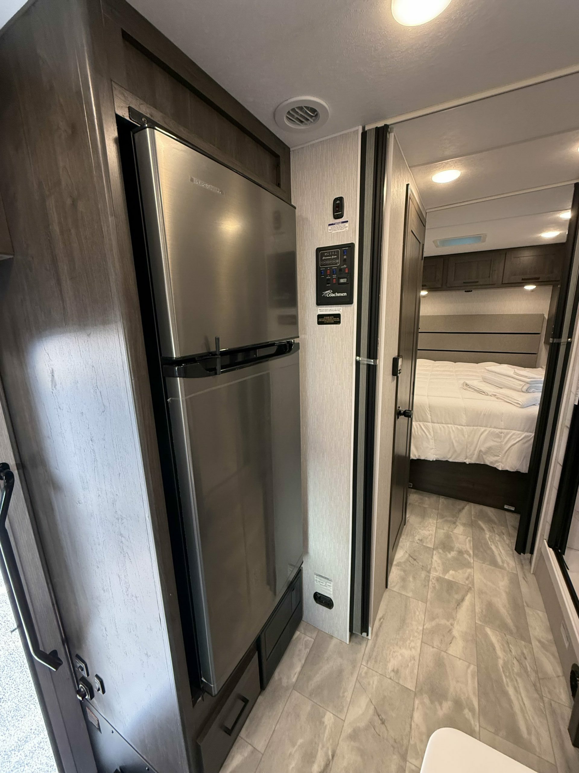 You’ll love the convenience of a full residential-size refrigerator to keep all your favorite meals and snacks on hand, and with two air conditioners, everyone stays cool no matter where the road takes you. The onboard generator, automatic leveling system, and sturdy driving performance make traveling simple and stress-free. When it’s time to unwind, you can enjoy a movie on the TV or step outside under the awning for a little shade and fresh air.