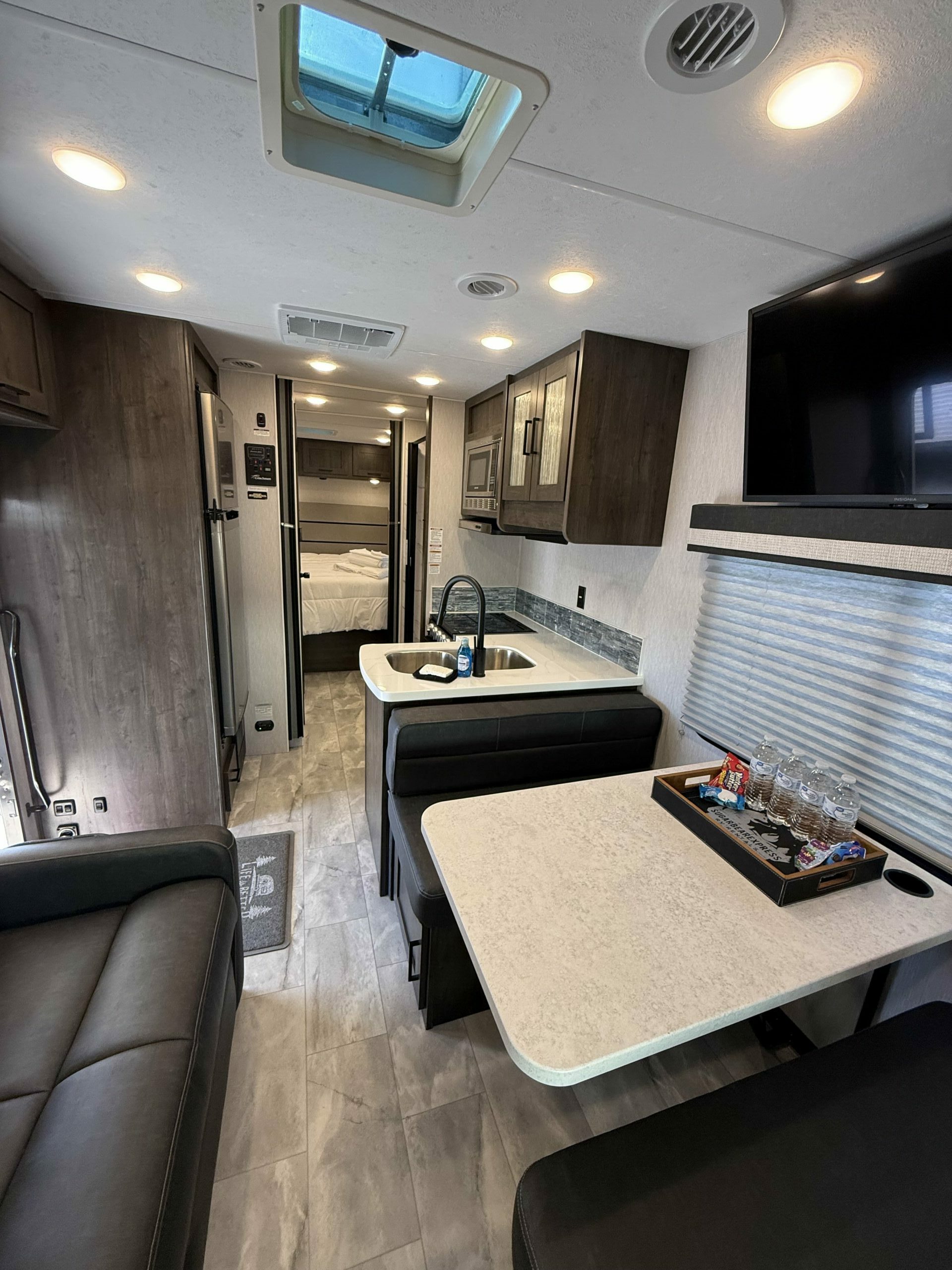 Our newest Class C just added to the fleet with all of your camping needs! Sugarbear #10 is getting welcomed to our fleet because she has one of our favorite floor plans. This beautiful Four Winds has our biggest storage compartment in the entire fleet. You can bring your cooler and scooters with you! Inside you are greeted with a modern and stylish interior. She sleeps 6 comfortably, has two big TV’s, as well as a large bathroom. The back bedroom suite will provide you with all of the privacy that you will need. Don’t waste another minute, and book this Bear before she is gone!