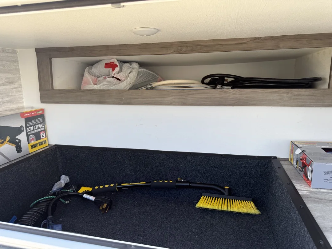 “From the Owner” – It’s a fleet favorite for our VIP clients to use as a greenroom backstage, etc. She has everything from a King Sized suite, with its own private bathroom, to 3 bunk beds for the kiddo’s and a full sized fridge to feed all of the cubs. The oversized kitchen dinette is great for family dinners, while you enjoy the inside fireplace, or you can take it outside to the double awning! You can watch the game with our outdoor entertainment center, while the kids roast marshmallows , while enjoying the outdoors in luxury. The endless storage compartments underneath allow for you to pack or lock up all of your camping accessories. From inside to out, this Big Bear has everything!